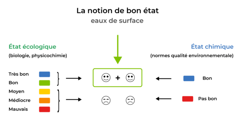 Un cours d’eau sera considéré en bon état si tous les paramètres mesurés de la qualité physico-chimique et biologique sont en bon ou très bon état. Si au moins un des paramètres est déclassé, le cours d’eau sera déclassé.